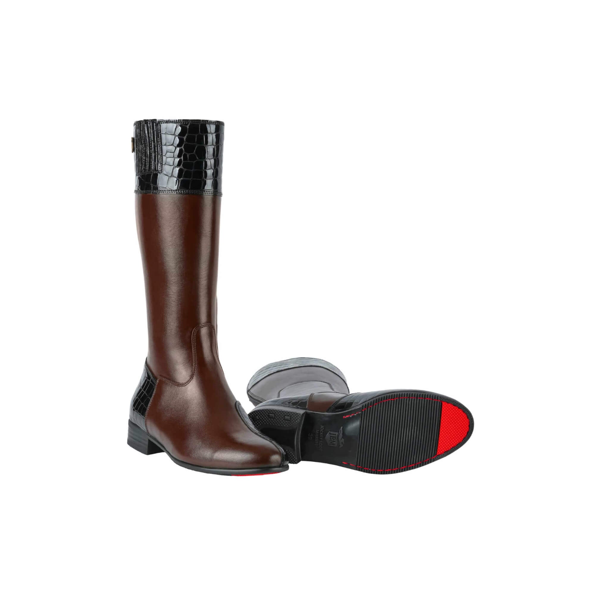 Stand out with the Menzil, a bold blend of smooth brown leather and high-shine black croc detailing. Crafted for riders who appreciate refined style with everyday practicality, this tall boot offers a sleek, contoured fit that softens and adapts with wear. The full-length zipper ensures effortless entry, while the durable anti-slip outsole provides confident stability on all surfaces. Finished with the signature JBM crest, the Menzil delivers modern elegance and reliable performance in and out of the saddle.